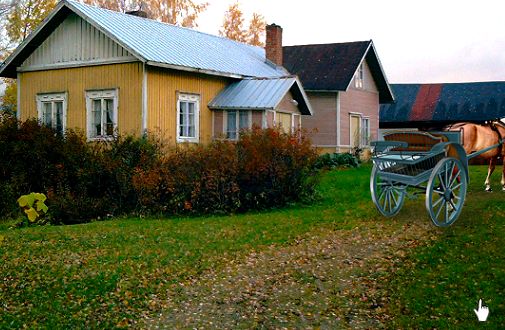 Monitaituri Hermanni Teemun tupa Nopankylän Rehuperällä. Pihassa vinopuikkoinen. |