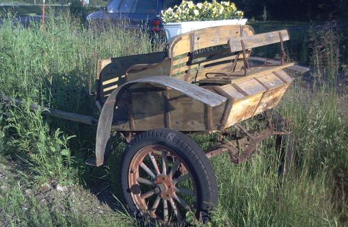 Kumipyöräinen kukkapurkki, valkjärveläinen kärrymalli maastossa maatumassa. |